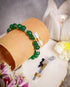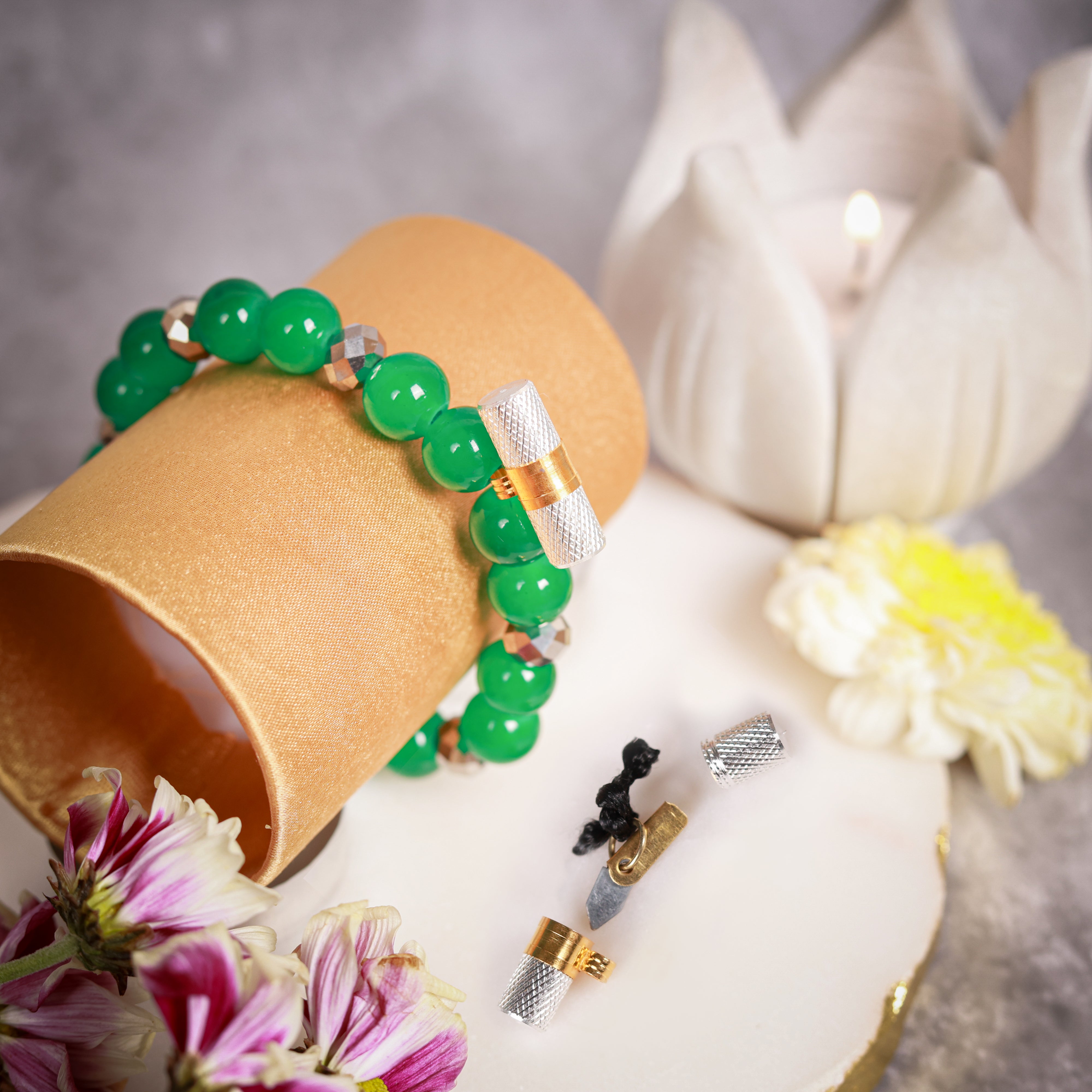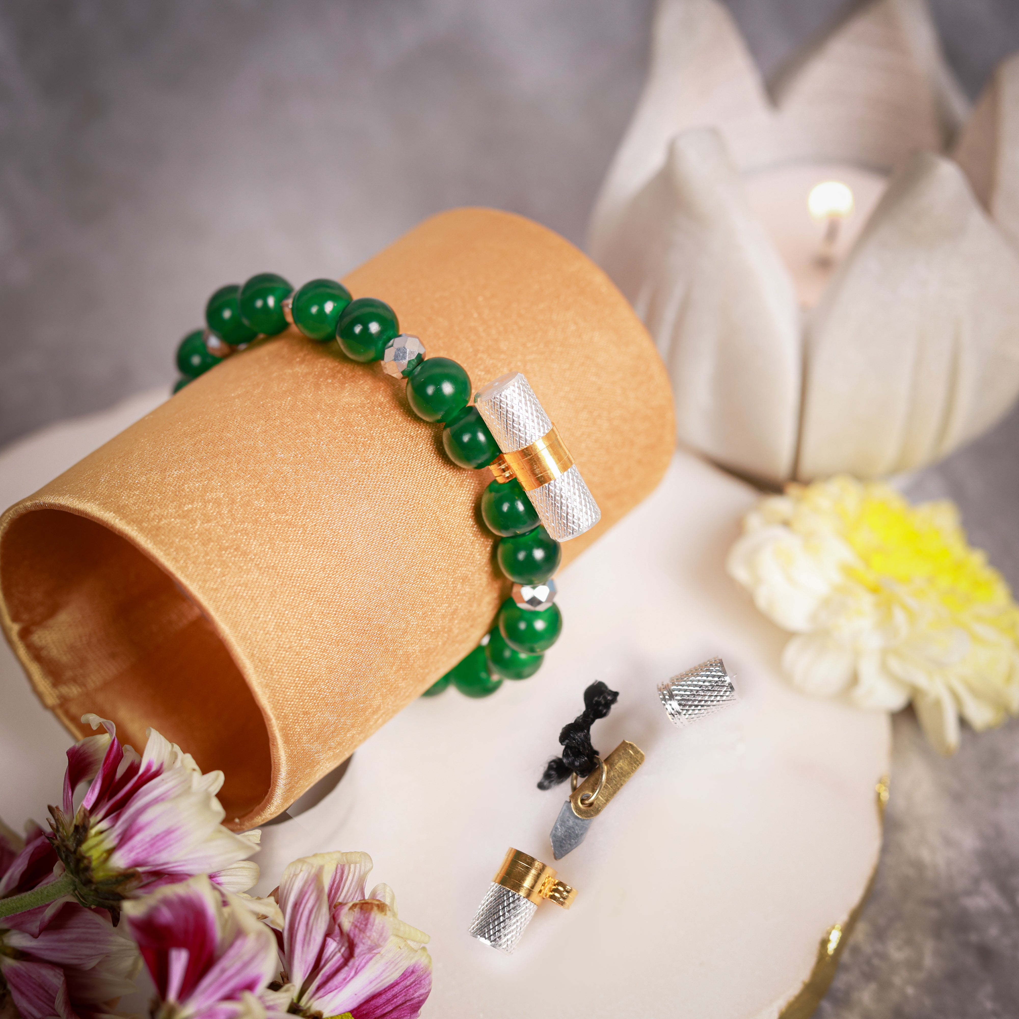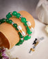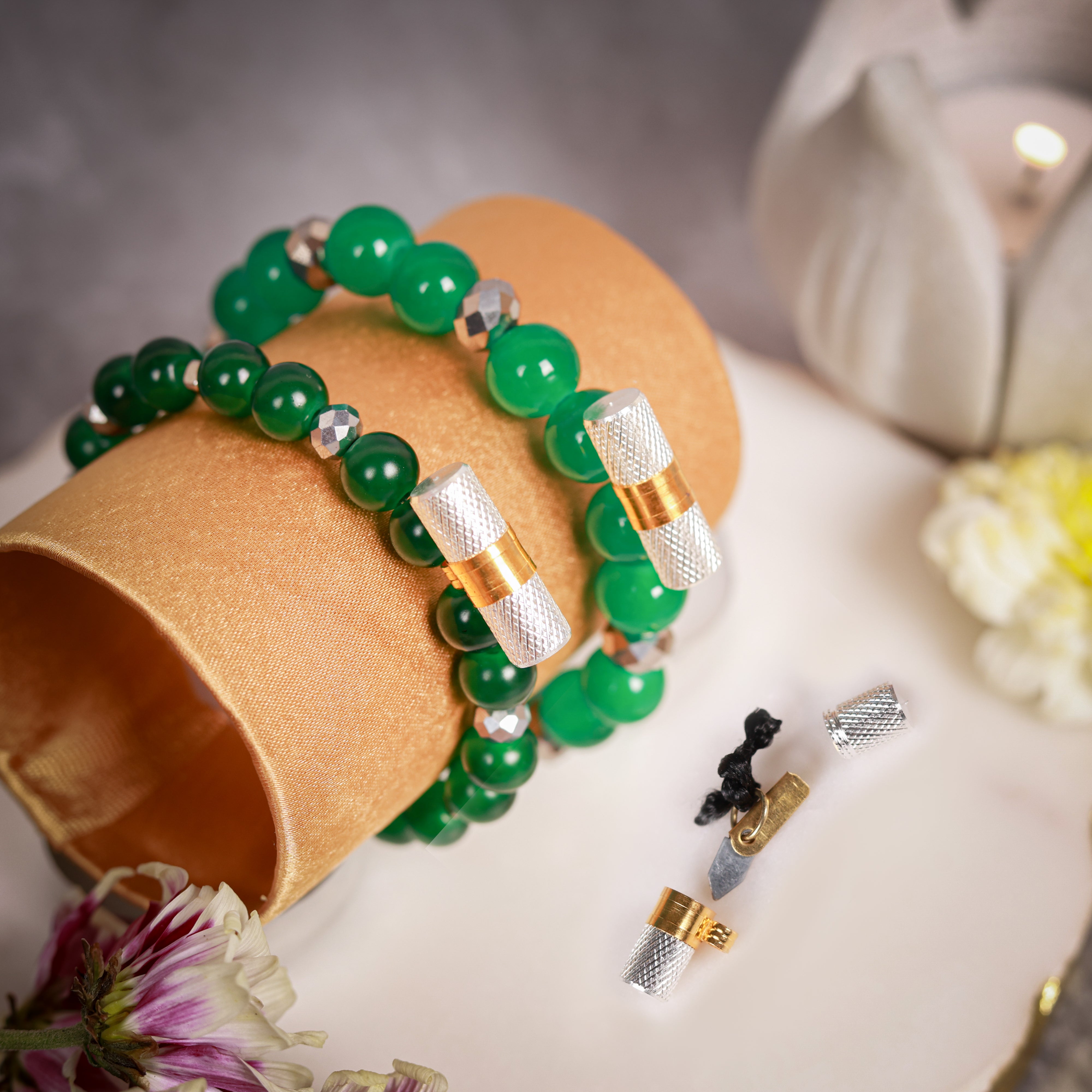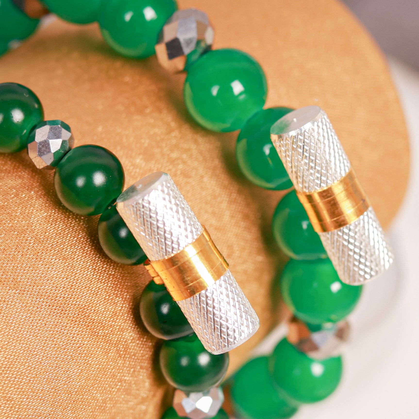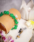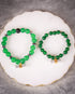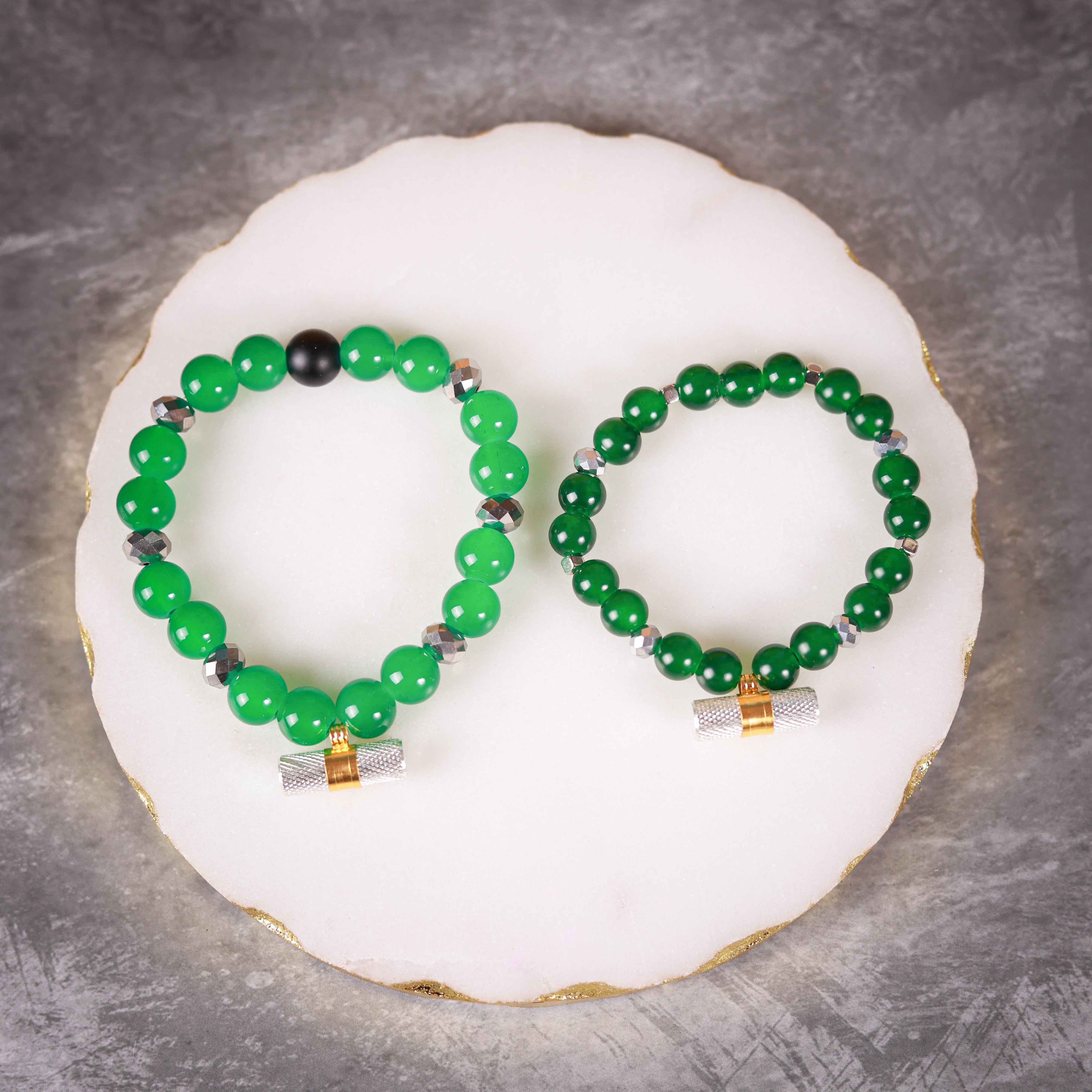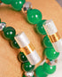 Set of two deep green beads & metallic silver crystals with energised lucky charms