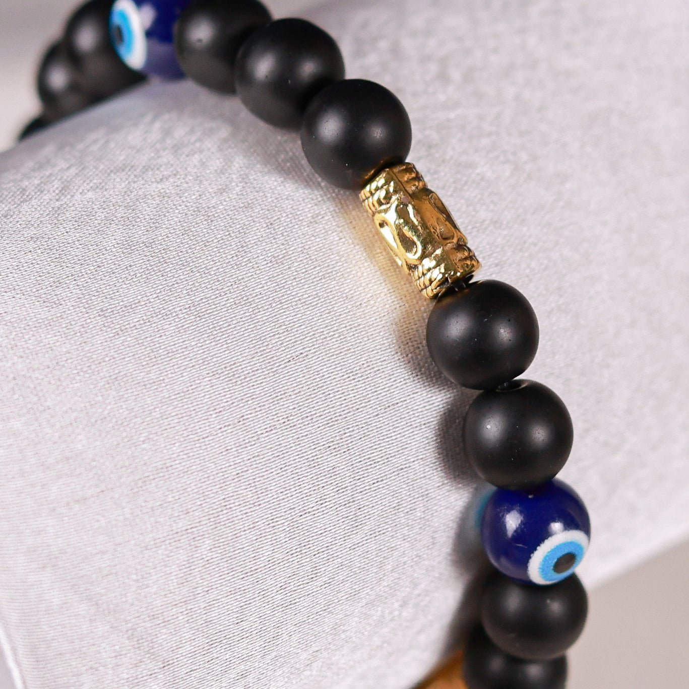 Black Matte Beads and Intricately Designed Golden Charms with Navy Blue Evil Eye